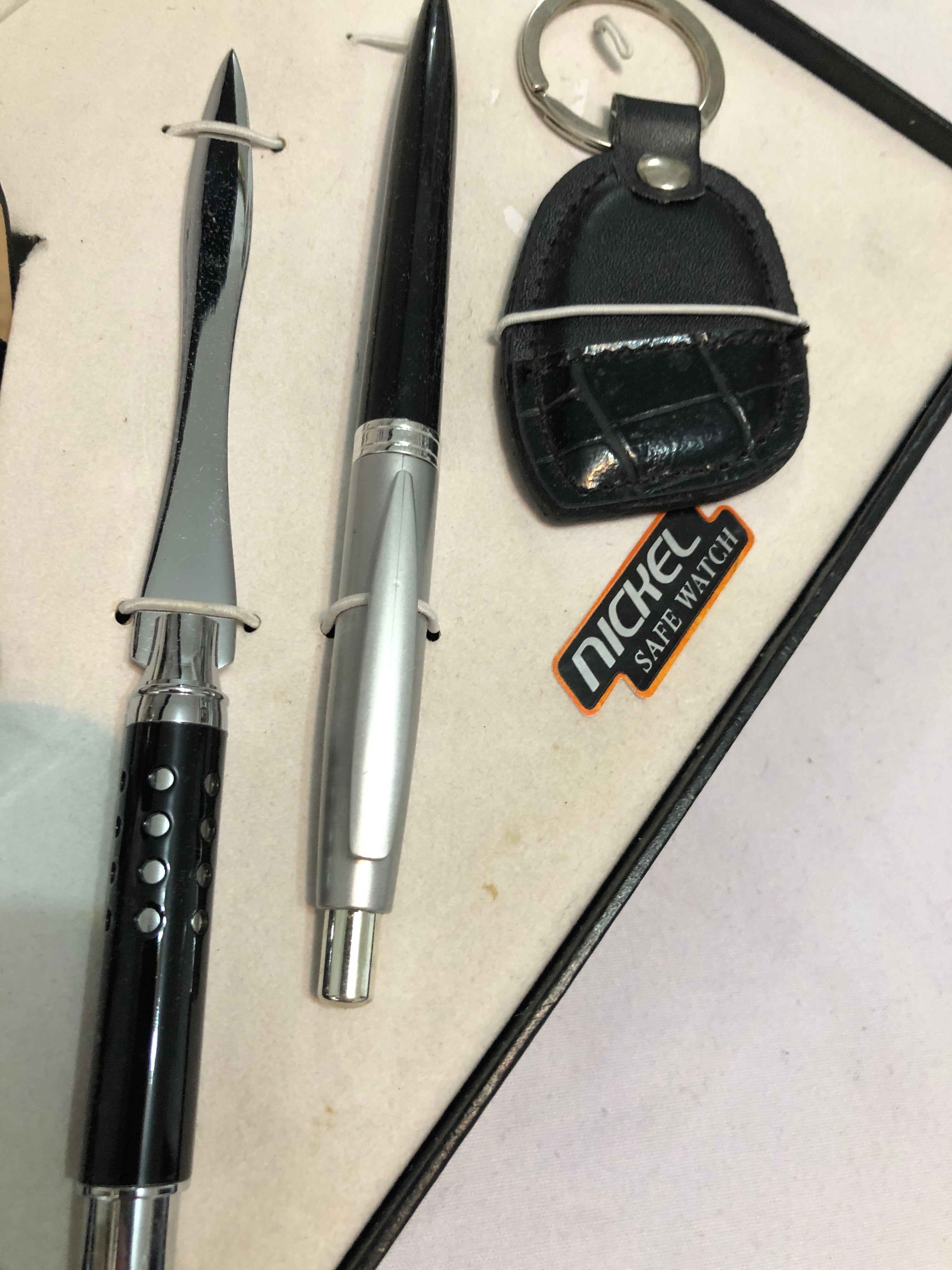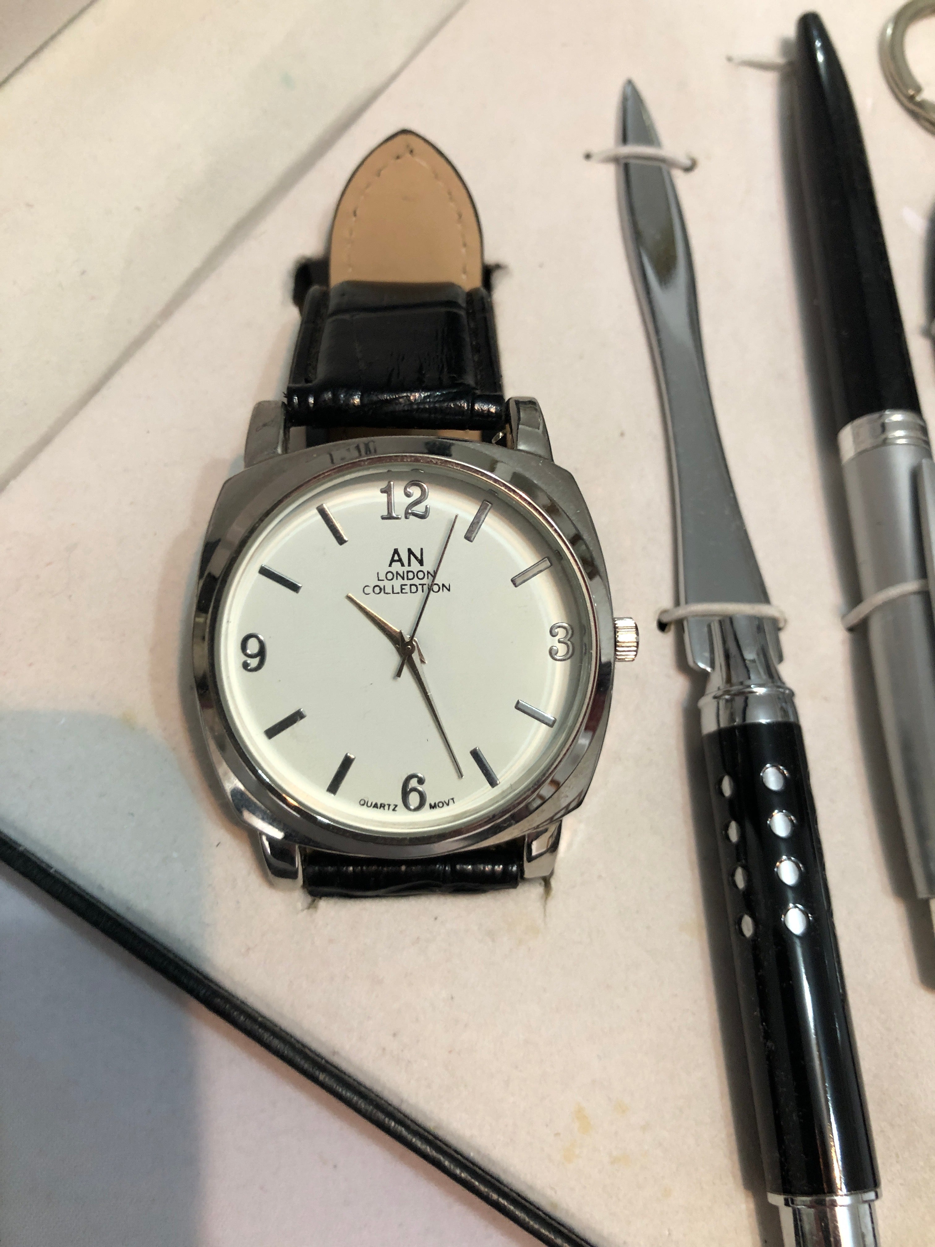 It comprises of a wristwatch, letter opener, pen & key ring.