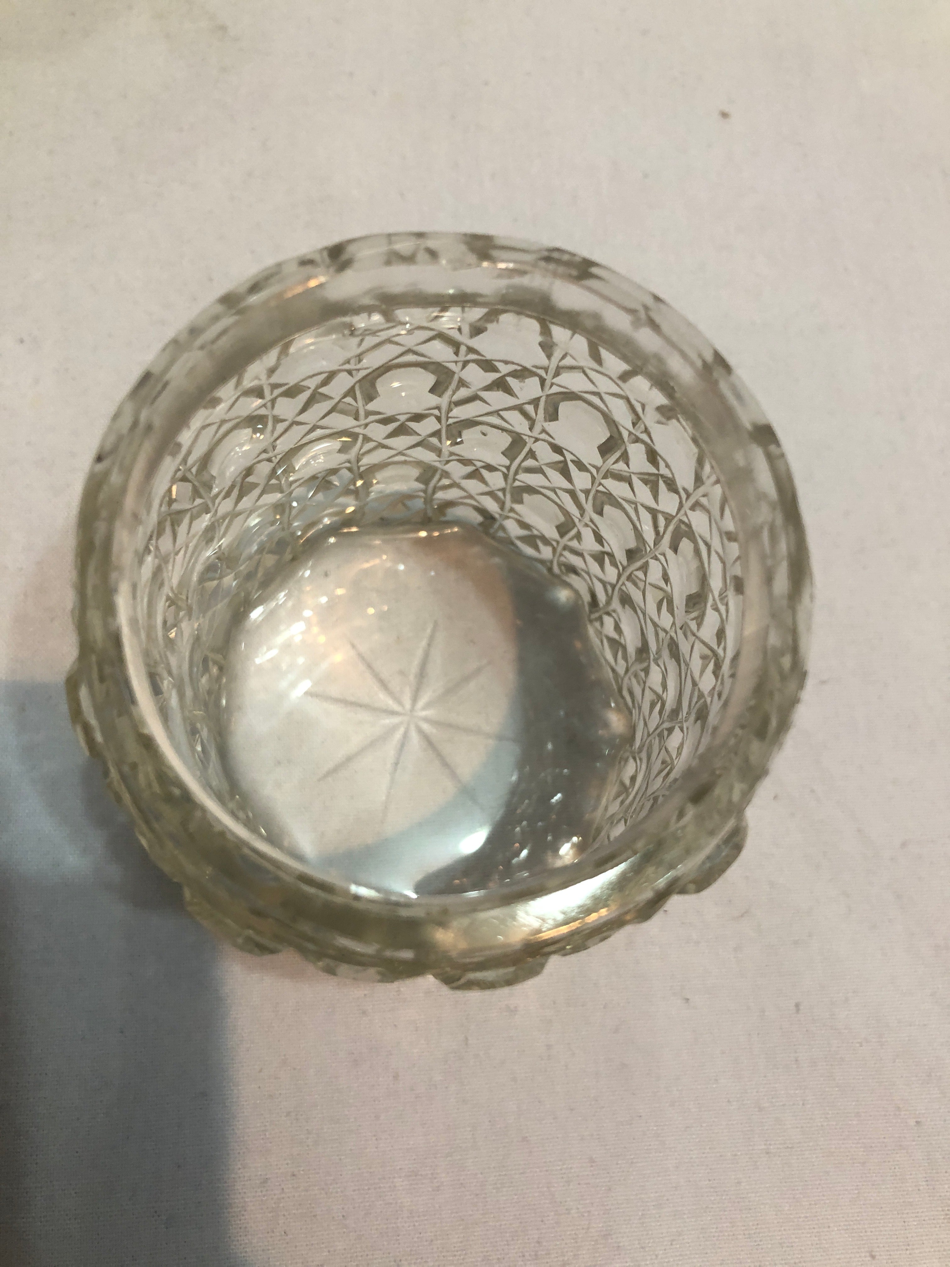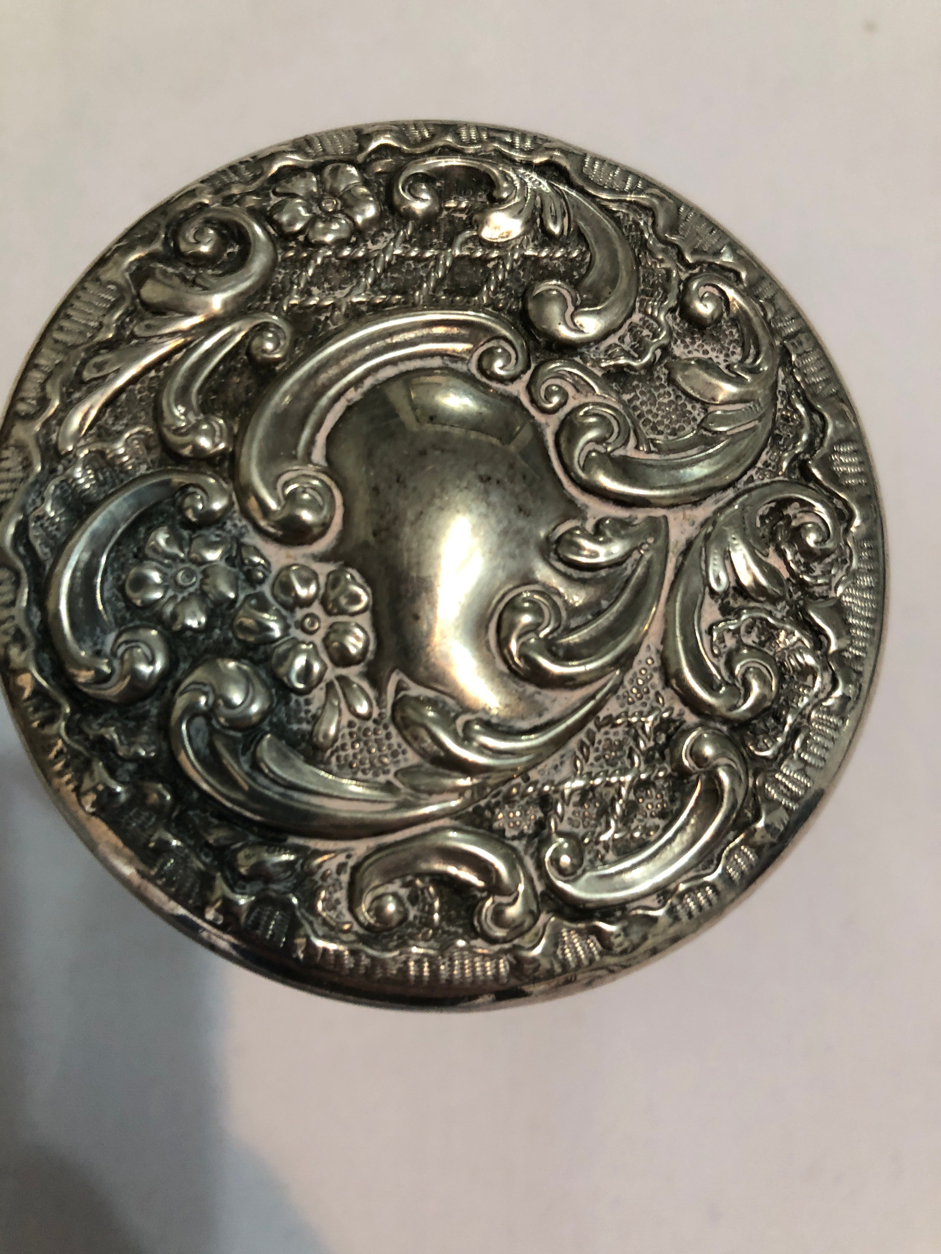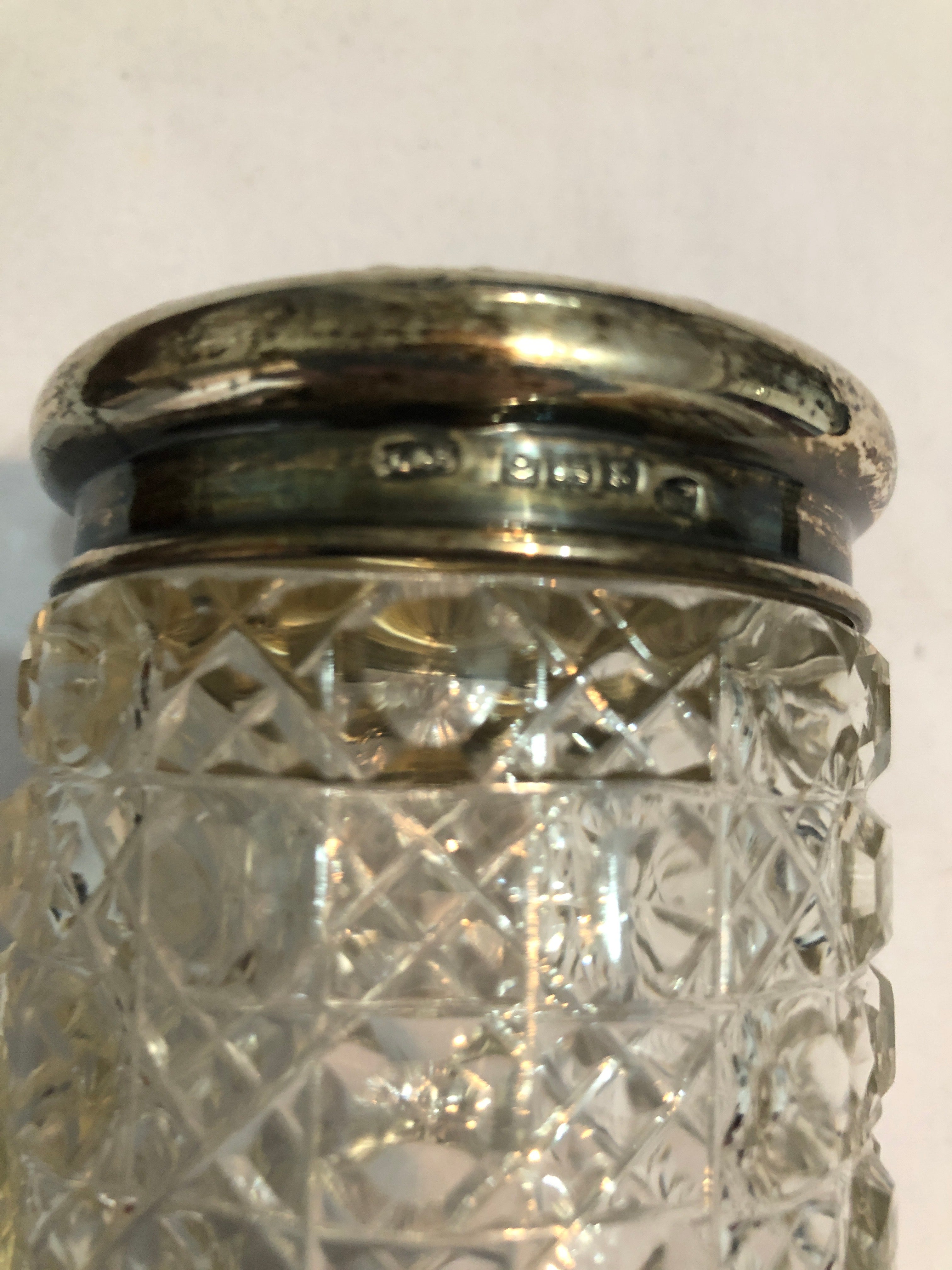 The top is hallmarked and I can find no damage with the exception of a tiny nibble when I run my finger around the rim of the jar. It certainly is not noticeable.