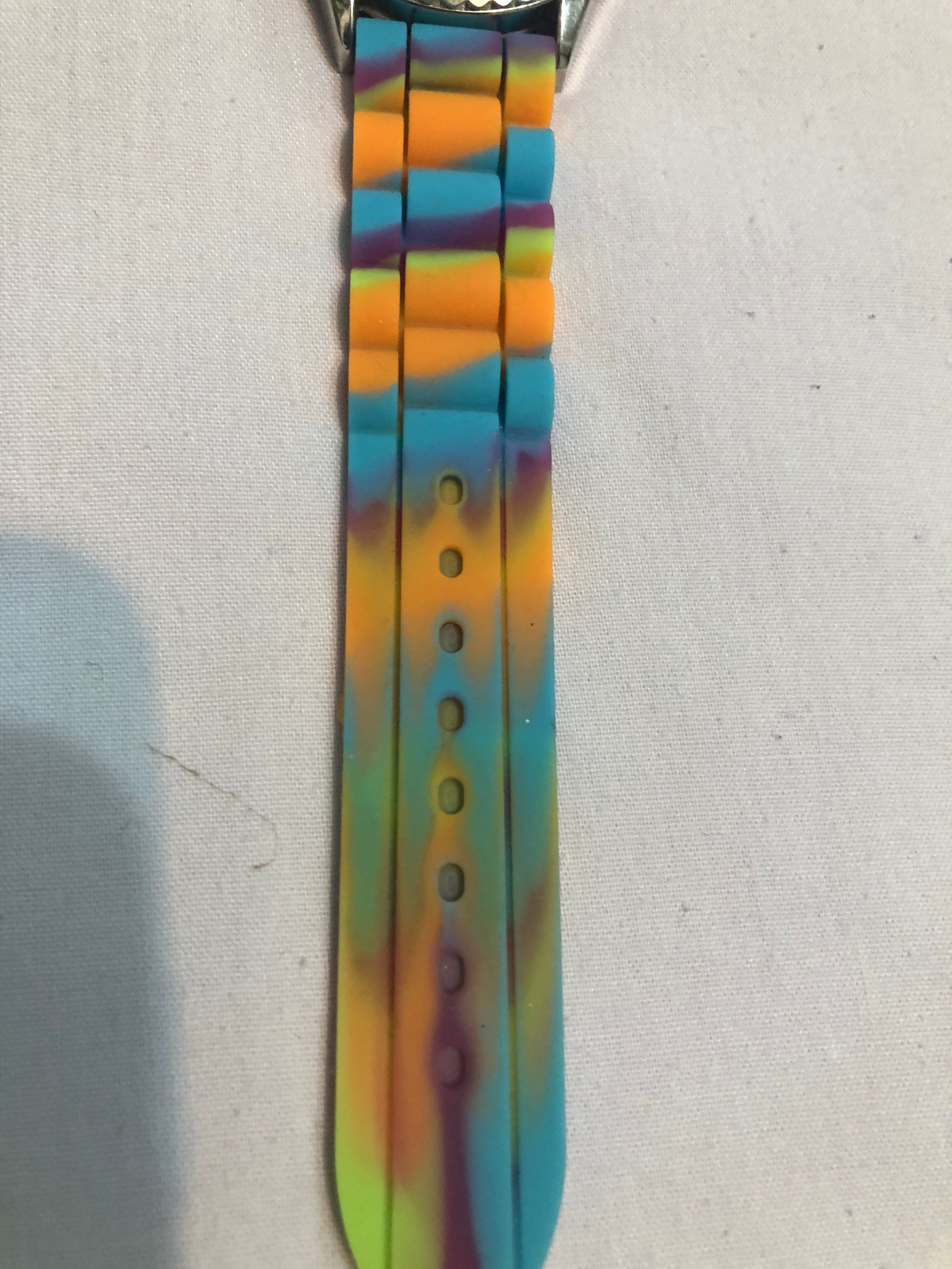 It comes with a muti coloured strap and is unworn. Sadly I no longer have the original box.