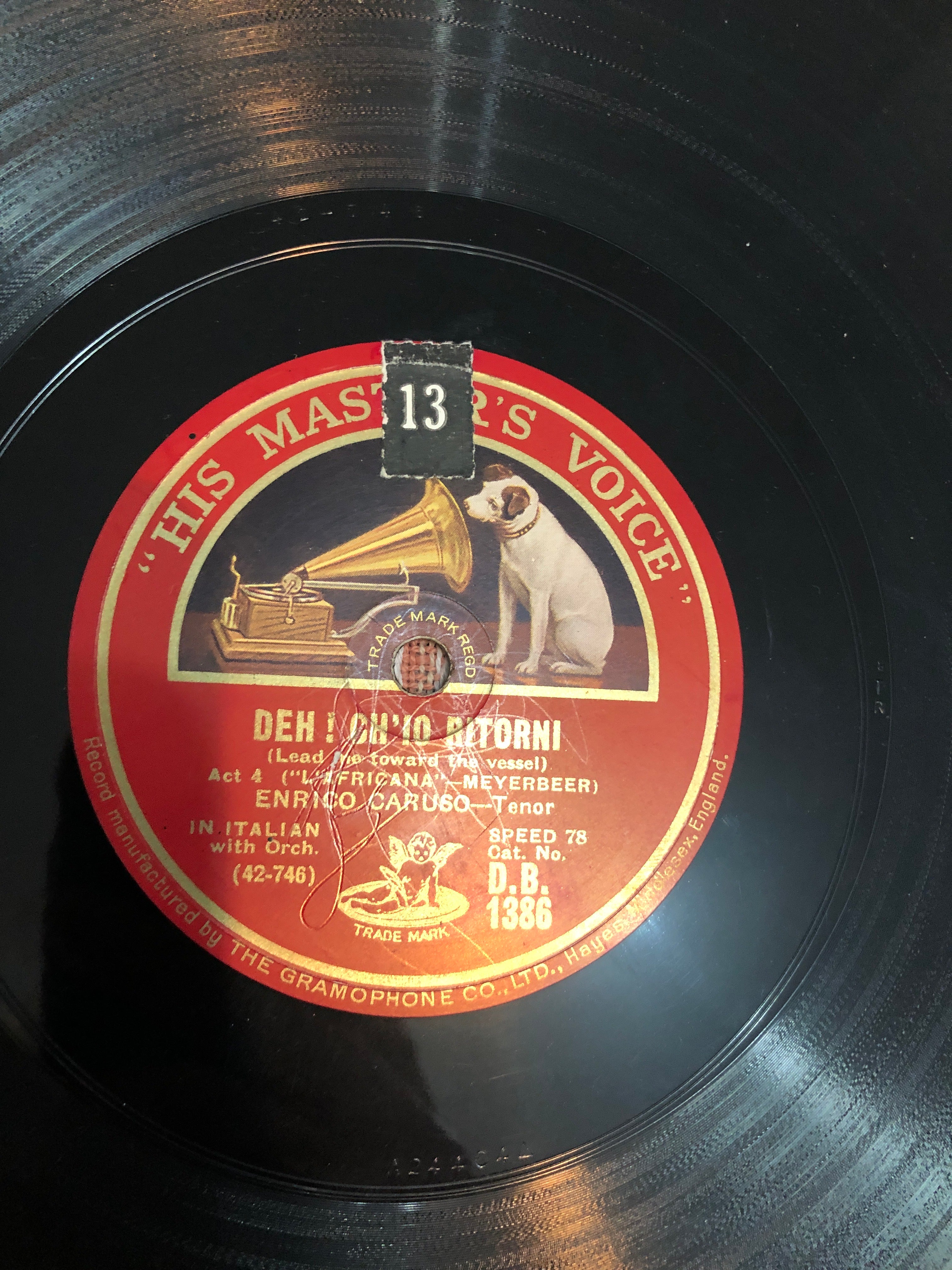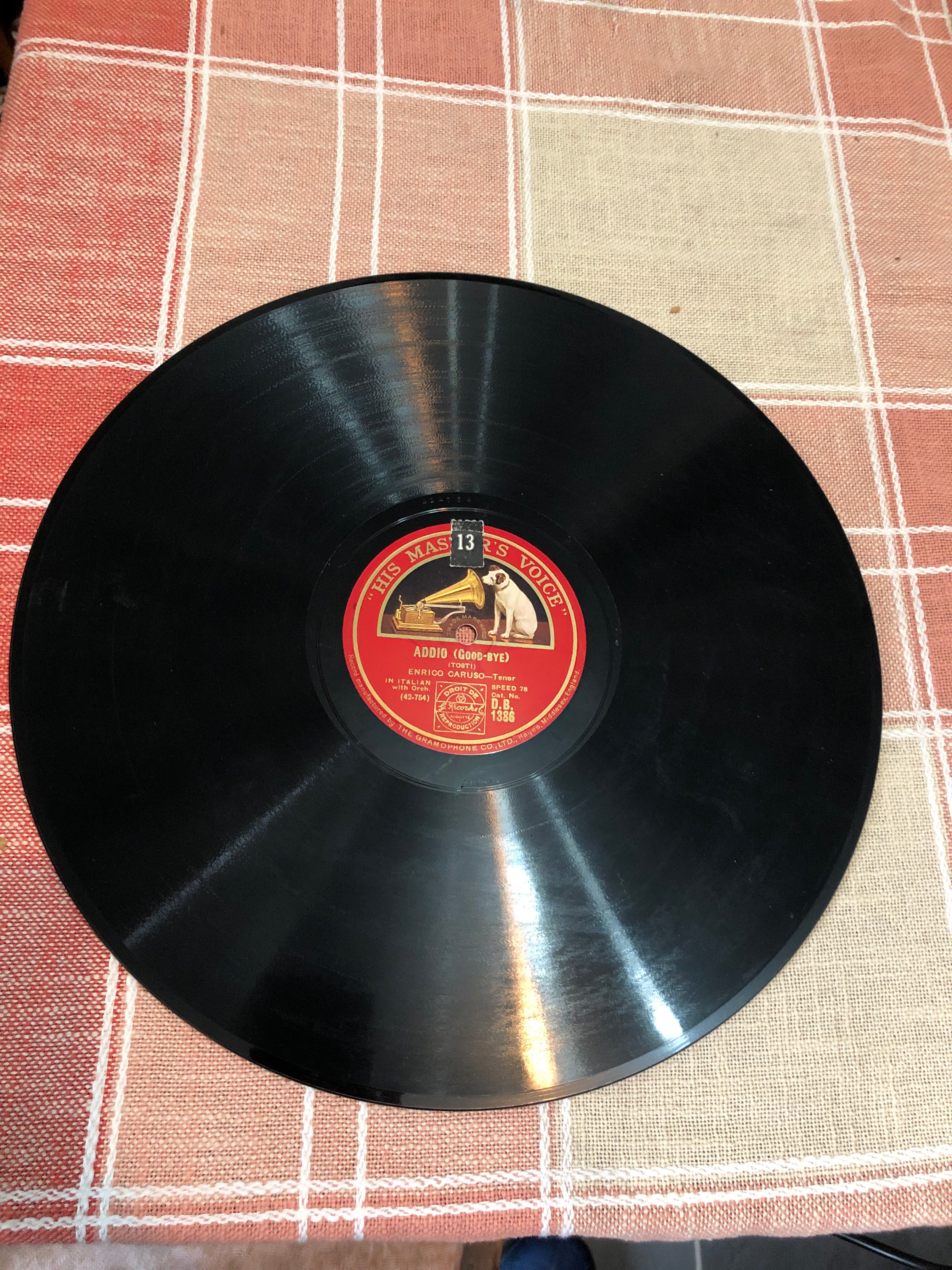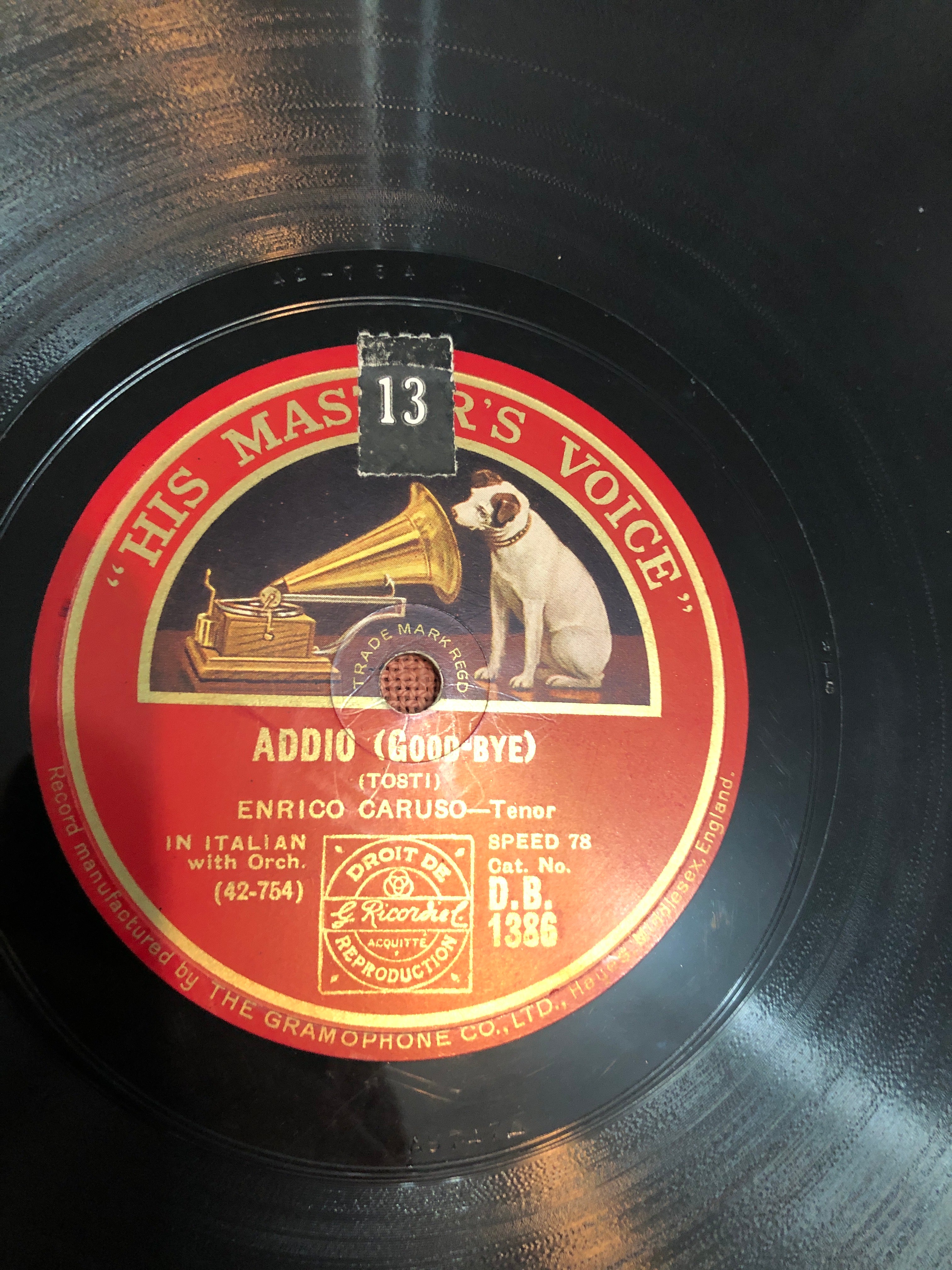 Here we have a 12inch 78rpm recording on the HMV Label of Enrico Caruso singing Addio & Deh Oh lO Ritorni.