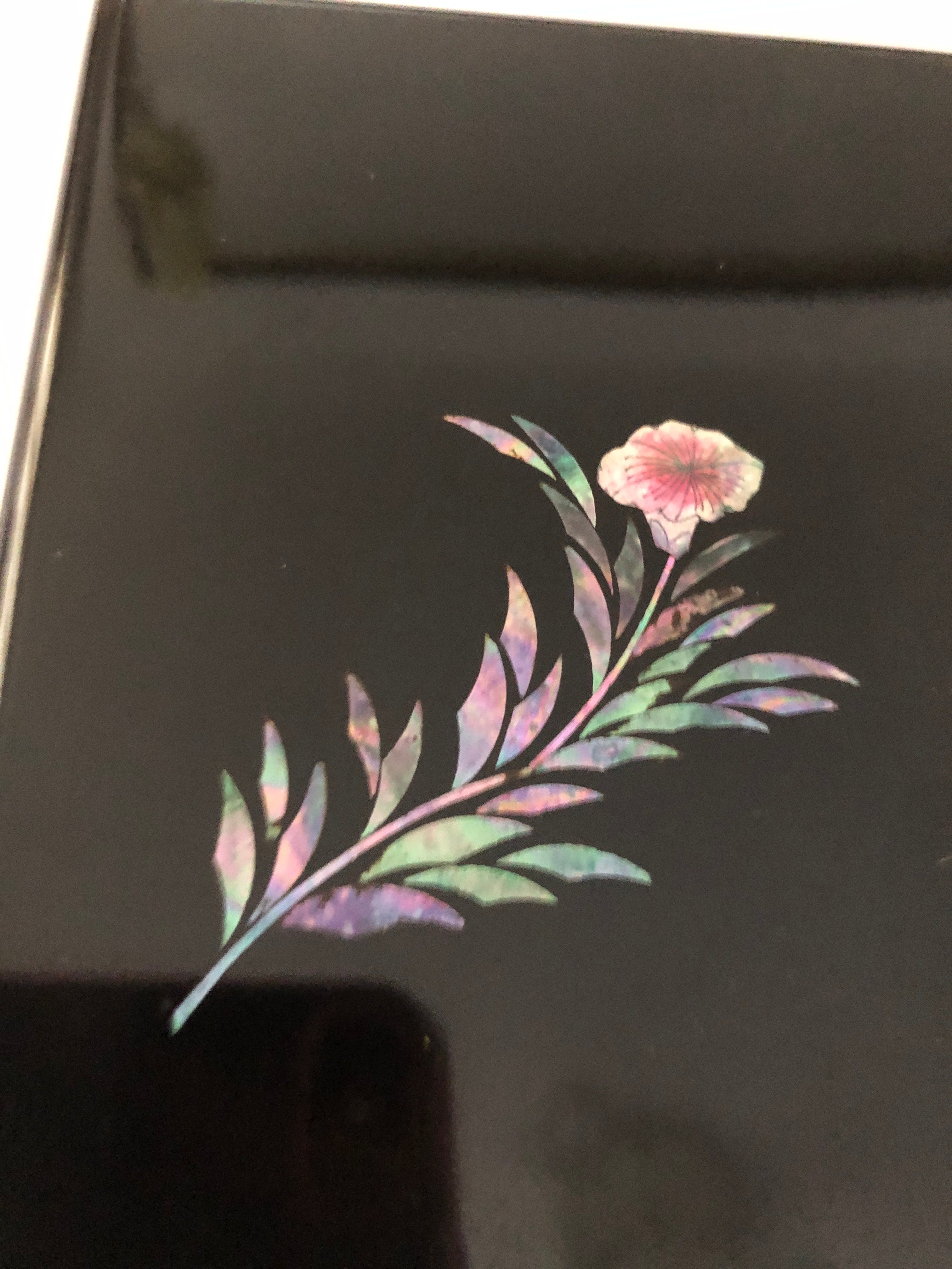 Here we have a lovely Japanese Lacquerware Trinket Box with a Mother Of Pear flower on the lid.