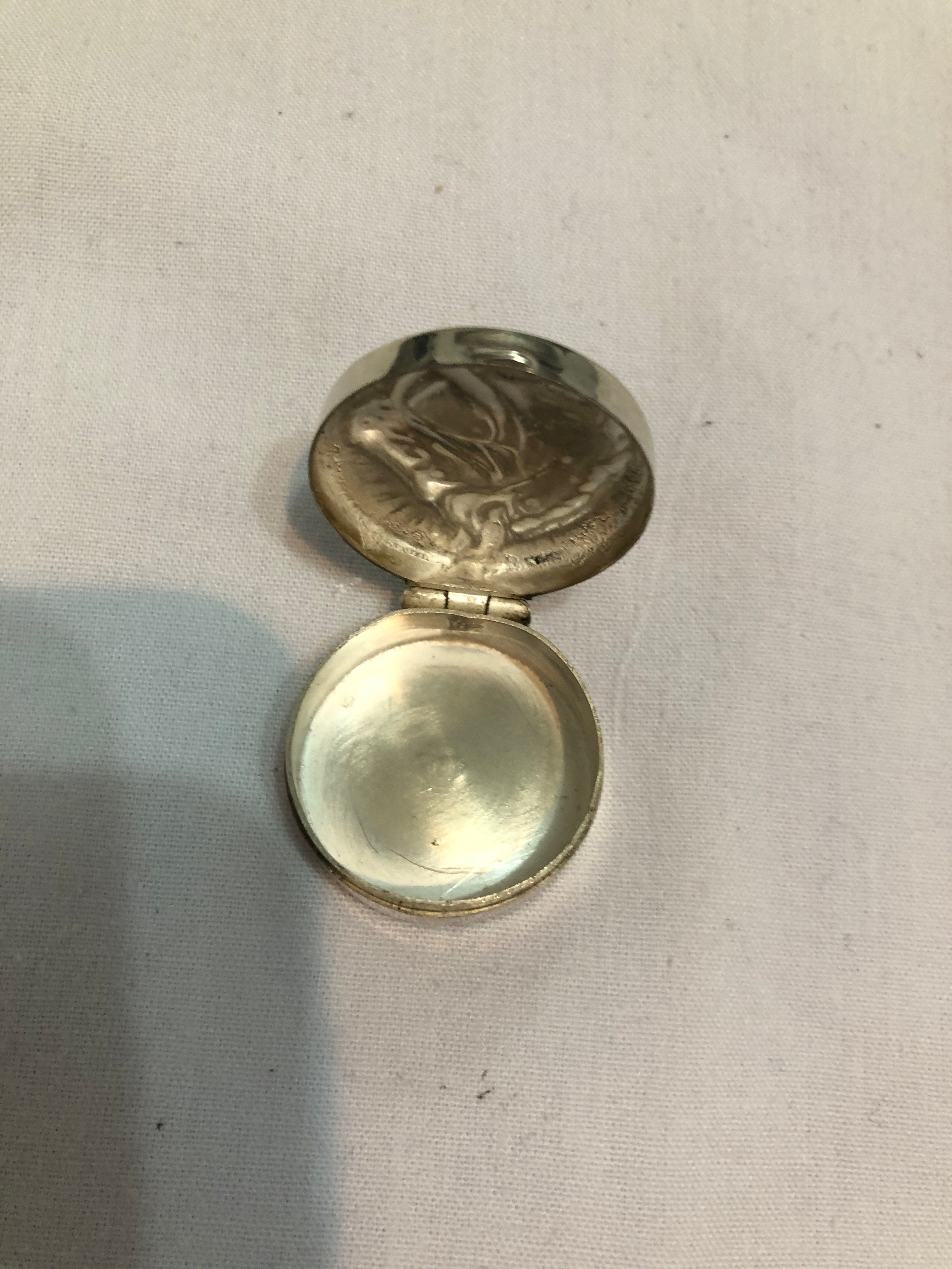 Silver Pill Box with Horses Head Embossed On Lid.