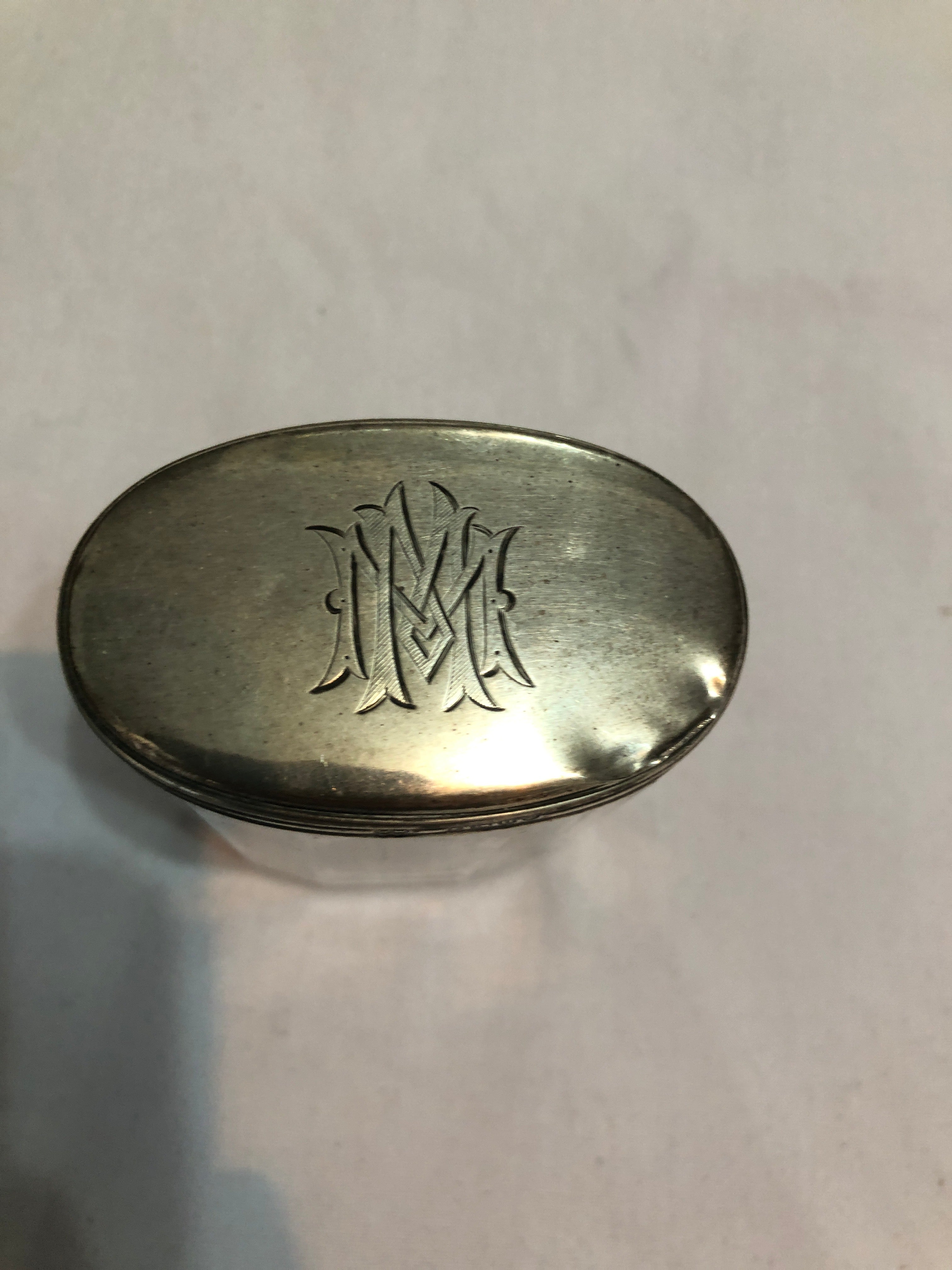 Here we have a lovely antique Dressing Table Jar with a Hallmarked Silver Top.