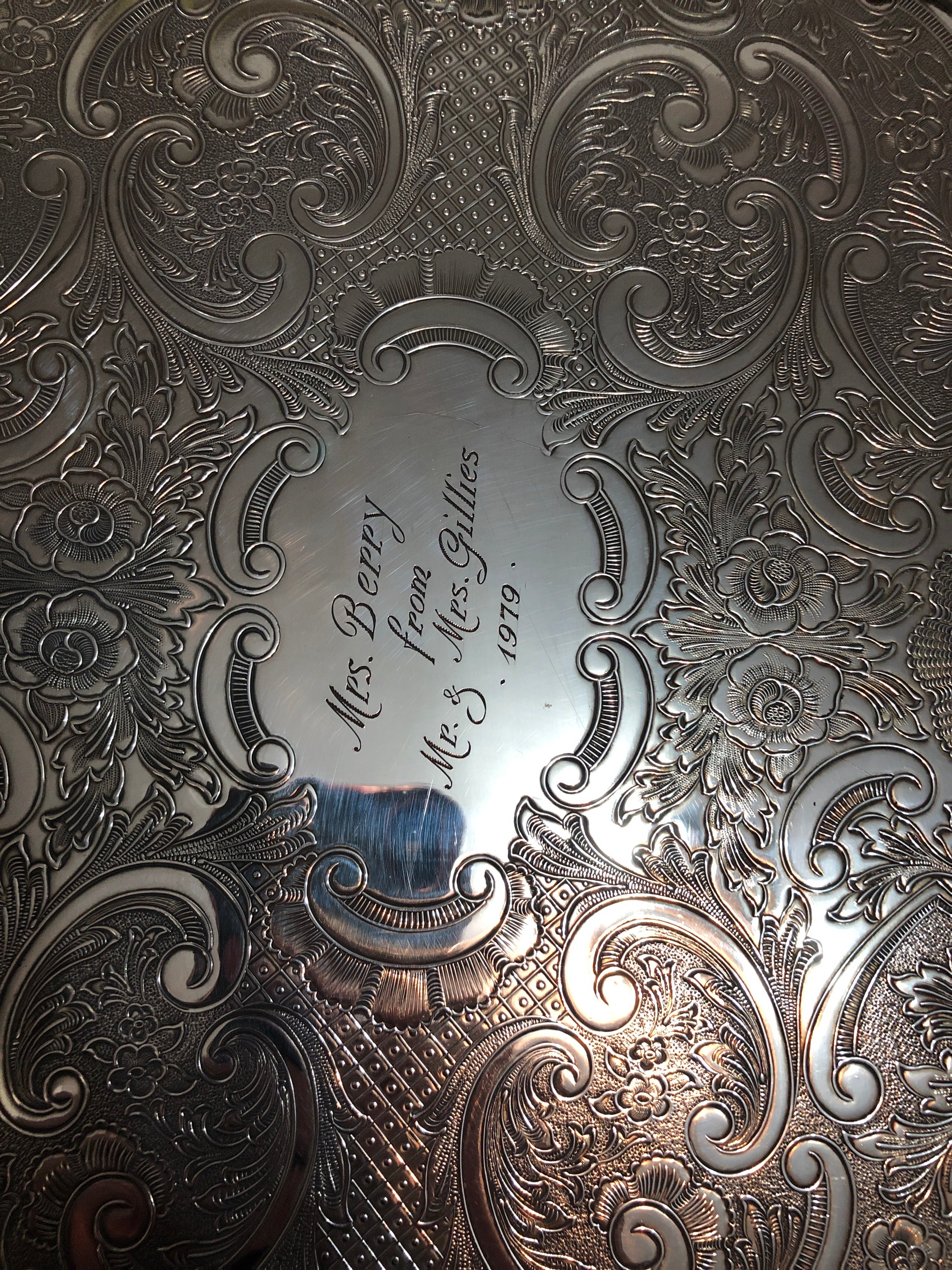 It is in excellent condition and in the centre it is engraved : Mrs Berry From Mr & Mrs Gillies 1979.