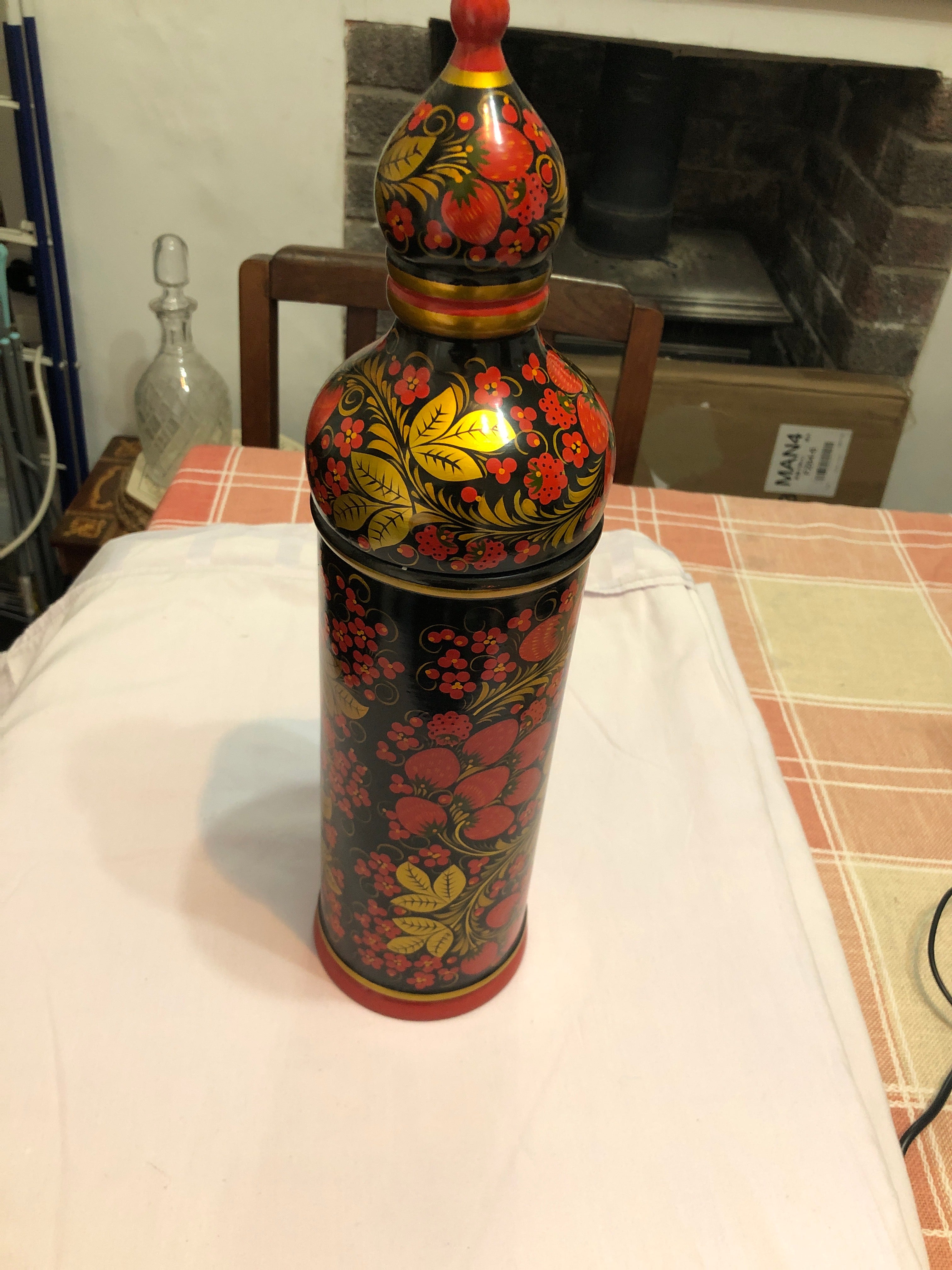 Here we have a lovely Vintage Russian Khokhloma Plate, Cups & Musical Decanter.